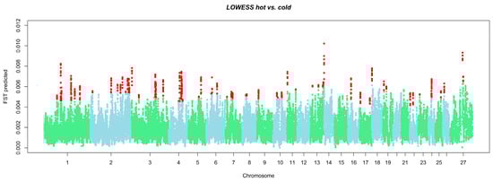 Wright’s fixation index (FST) was used following the metrics proposed by Nei [] and implemented via an in-house Python script. Subsequently, a locally weighted scatterplot smoothing regression (LOWESS) was applied using PROC LOESS in the SAS software 9.2 (SAS Institute, Cary, NC, USA) according to [] (the smoothing parameters are reported in Table S1). The smoothing parameters were chosen in such a way that each window interval always included 20 SNPs. The chromosome-wide smoothing parameters were computed as 20/number of SNPs. The control chart of PROC SHEWHARD in SAS was used to identify outlier markers that exceeded three standard deviations from the chromosomic mean value, according to Sorbolini et al. [] (see Supplementary Files for full scripts). The Manhattan plot of LOESS-predicted FST was prepared using the qqman package (v. 0.1.9) in R (v. 4.3.1).