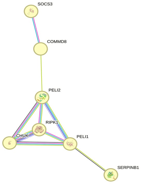 The small network reported in Figure 2, derived from the larger protein–protein interaction network composed of genes retrieved in this study (Supplementary Figure S2), includes the key regulators of inflammatory responses, apoptosis, NF-κB signaling, and protease inhibition, all of which are crucial for cells to survive and adapt under heat stress conditions. Heat stress responses can be related to different molecular mechanisms, such as the inflammatory response or the activation of cell death pathways. The SOCS3 gene helps to regulate cytokine activity, preventing excessive inflammation [], whereas proteins such as RIPK1 mediate cell death decisions to ensure the damaged cells are cleared without excessive necrosis, which would lead to inflammation []. On the other hand, molecular mechanisms related to survival pathways and protective action might be associated with heat stress responses []. NF-κB pathway members such as CHUK and COMMD8 activate survival pathways (inducing the expression of heat shock proteins and other protective molecules) [], while SERPINB1 prevents protease-induced damage during stress response, making it a key player in cellular homeostasis under heat stress []. Conserved Helix Ubiquitous Kinase (CHUK) is part of the NF-κB signaling pathway, which plays a role in responding to stress stimuli; it has also been associated with mammary gland health in dairy sheep []. Heat stress can activate NF-κB signaling, leading to the expression of HSP and inflammatory mediators. This helps cells to cope with the accumulation of damaged proteins and other stress-induced injuries. In cattle, the NF-κB pathway was activated under heat stress, enhancing the expression of protective proteins such as HSP, which refold damaged proteins and prevent protein aggregation [].