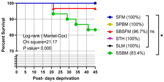 The survival rate of the marron fed test diet during the starvation test. Mean ± SE (n = 3). ns indicates not significant. * p < 0.05 denotes significant differences. SFM: starved marron initially fed fishmeal; SPBM: starved marron initially fed poultry by-product meal; SBSFM: starved marron fed initially black soldier fly meal; STH: starved marron initially fed tuna hydrolysate; SLM: starved marron initially fed lupin meal; SSBM: starved marron initially fed soybean meal.