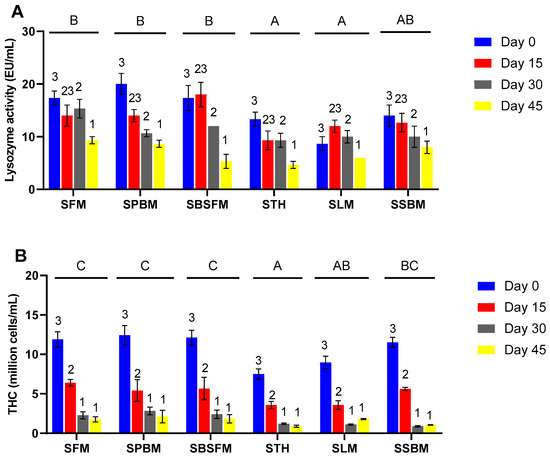 Lysozyme activity (A) and THC (B) in marron during feed deprivation. The values are mean ± SE (n = 3). Letters (A, B, C) indicate significantly different means for different groups at p < 0.05. Different numbers (1, 2, 3) denote significantly different means at times of feed deprivation. Two-way ANOVA, followed by Tukey post hoc test at p < 0.05 determined the effects of treatments on lysozyme, feed deprivation durations on lysozyme activity, and their interaction between treatments and feed deprivation durations. SFM: starved marron initially fed fishmeal; SPBM: starved marron initially fed poultry by-product meal; SBSFM: starved marron fed initially black soldier fly meal; STH: starved marron initially fed tuna hydrolysate; SLM: starved marron initially fed lupin meal; SSBM: starved marron initially fed soybean meal.