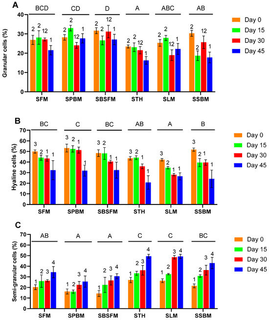 The percentage of granular cells in starved marron was significantly lower at day 45 than in the first 30 days of feed deprivation. SBSFM and SPBM showed a significantly (p < 0.05) higher percentage of granular cells than the other marron (Figure 3A). The hyaline cell proportion of starved marron significantly decreased from day 0 to day 30, but the same percentages of hyaline cells were found on day 30 and day 45 (Figure 3B). By contrast, the semi-granular cell percentages of starved marron increased significantly (p < 0.05) as the starvation time progressed (Figure 3C). STH and SLM obtained higher rates of semi-granular cells than other starved marron.