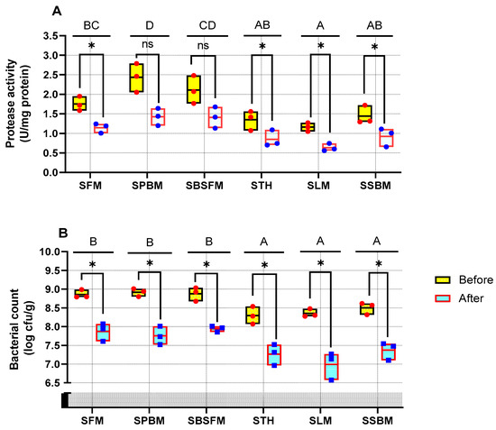 The protease activity (A) and total bacterial count (B) of starved marron before and after feed deprivation. Two-way ANOVA, followed by Tukey post hoc test with p < 0.05 determined the effects of treatments on lysozyme, feed deprivation durations on lysozyme activity, and their interaction between treatments and feed deprivation durations. Letters (A, B, C, D) represent significant differences among treatments. * p < 0.05 indicates a significant difference before and after feed deprivation. ns denotes non-significant differences. A paired t-test determined the significant difference between the starved marron groups before and after feed deprivation. The line within each box represents the median. The results are expressed in mean ± SE (n = 3). The dots indicate the replicate (n).