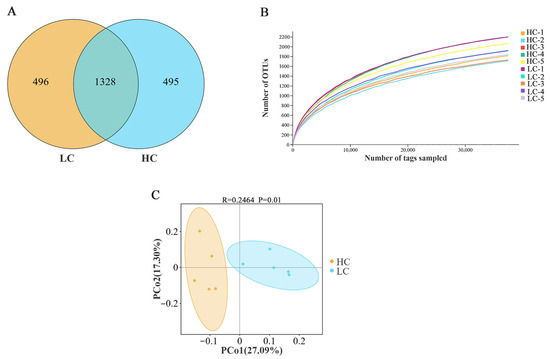 Microbial communities between the two groups. (A) Venn diagram illustrating unique and common OTUs between the groups. (B) The rarefaction curve for each sample in both groups. (C) PCoA using the weighted uniFrac distance. LC, low-dietary-concentrate-level group; HC, high-dietary-concentrate-level group.