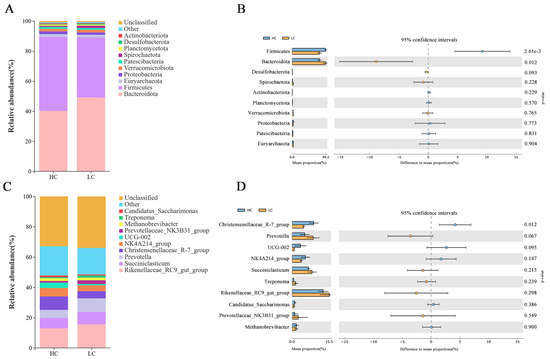 Ruminal bacterial compositions in the two groups. (A) Relative abundance of phyla. (B) Dominant phyla in the LC and HC groups. (C) Relative abundance of genera. (D) Dominant genera in the LC and HC groups.