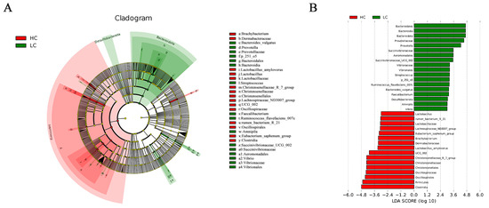 LEfSe analysis of ruminal bacteria in the LC and HC groups. (A) Evolutionary plots showing that the LC and HC groups were significantly different in terms of microbial species. (B) Linear discriminant analysis score histograms based on categorical information.