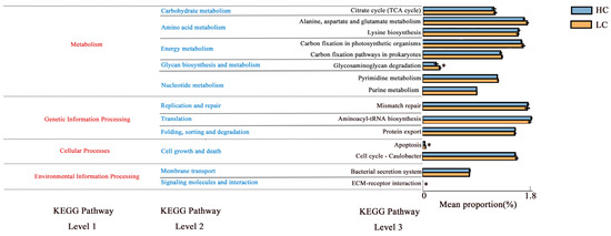 To better understand the functions of the ruminal microflora, PICRUSt 2 was utilized for functional prediction using KEGG. As shown in Figure 4, the bacterial genes in the ruminal fluids of the two groups of yaks encompassed the four major biological metabolic pathways in Level 1 KEGG analysis, namely, metabolism, genetic information processing, cellular processes, and environmental information processing. Their average proportions were 79.28%, 14.30%, 4.04%, and 1.73%, respectively. KEGG Level 2 analysis showed that carbohydrate metabolism, amino acid metabolism, and energy metabolism were relatively abundant metabolic pathways in rumen microorganisms. At KEGG Level 3, the average abundance of glycosaminoglycan degradation, apoptosis, and ECM–receptor interaction in LC was significantly higher than that in HC (p < 0.05).