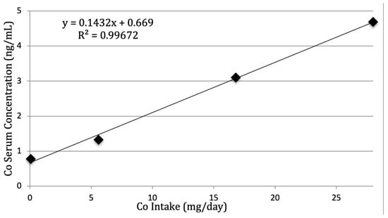 When the Indiana Horse Racing Commission (IHRC) began conducting post-race blood tests for Co, they found serum concentrations as high as 353 ng/mL in some Standardbreds. One Thoroughbred tested after winning a race had a serum Co concentration of 1127 ng/mL—nearly 45 times higher than the threshold [11]. Using the equation featured in Figure 1, when serum Co concentrations meet the threshold set by the IHRC (25 ng/mL), the estimated dietary intake would be at 170 mg/day. Most troublesome, however, is that when serum levels reach 1127 ng/mL, the estimated dietary intake would be at 7900 mg/day. This is over 280 times the amount provided to the high treatment group in this study. Granted, there is no evidence that the relationship is linear when Co administration is beyond what was provided in this study. However, it does suggest that the amount provided to the racehorses testing positive was far beyond what one would feed in normal circumstances.