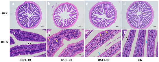Figure 1 shows the histological examination of the intestine. The findings from our examination of intestinal morphology are summarized in Table 2. Substituting 10% of FM with BSFL resulted in a normal intestinal tissue structure, with intact integrity and well-defined striated margins (black arrow, Figure 1A). The intestinal villi were intact and neatly extended into the intestinal lumen, showing no signs of damage or shedding. The muscle thickness, villi length, villi width, intestinal wall thickness, and mucosal thickness of the intestine were comparable between the BSFL10 and CK groups, indicating that the BSFL10 diet did not have any discernible impact on intestinal morphology. The CK group exhibited well-developed intestinal villi, with closely organized columnar epithelial cells. The cytoplasm appeared loose and faintly stained, exhibiting foamy characteristics (black arrow, Figure 1D), with sparse striated margins (blue arrow, Figure 1D). Goblet cells were not prominent in either the CK or BSFL10 groups. When 30% and 50% of FM were substituted with BSFL, the aforementioned measurements appeared shorter and thinner. The villi were sparse, and the intestinal epithelial cells contained vacuoles (black arrow, Figure 1B,C), along with a few striated edges (blue arrows, Figure 1C). Furthermore, there was a slight increase in local subepithelial lymphocytes (yellow arrows, Figure 1B,C), along with an increase in goblet cells.