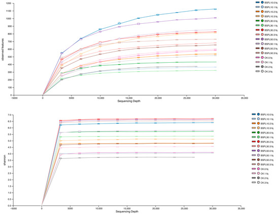 A total of 318,928 valid sequences were obtained from 16 samples through high-throughput sequencing. The number of sequences per sample ranged from 30,529 to 50,996, with an average of 39,866 sequences. Each treatment had a coverage rate above 0.99, indicating that the OTUs of the samples sufficiently represented their diversity (Table 3). The samples were normalized to 30,000 sequences before subsequent α-diversity and β-diversity analyses to minimize potential errors in diversity analysis due to variations in sequencing depths among samples. Analysis of the rarefaction curve (Figure 2) revealed a consistent trend as sequencing volume increased, indicating that the Sobs or Shannon index of each sample did not increase further with additional sequencing data. All samples were fully sequenced, encompassing a broad range of species.