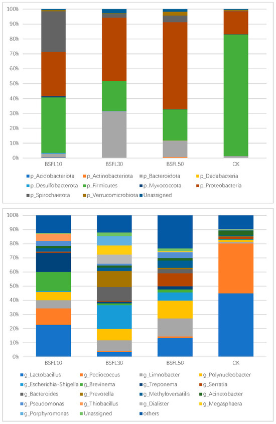 At the genus level, Lactobacillus and Pediococcus were the most prevalent. The CK group had higher levels of Lactobacillus and Pediococcus compared to the BSFL replacement group. The abundance of Lactobacillus in the CK group was 2.29, 21.49, and 4.97 times higher than in the BSFL10, BSFL30, and BSFL50 groups, respectively. The abundance of Pediococcus in the CK group was 3.49, 153.89, and 52.26 times higher than in the BSFL10, BSFL30, and BSFL50 groups, respectively. Other highly abundant bacteria included Limnobacter, Polynucleobacter, Escherichia–Shigella, Brevinema, Treponema, Bacteroides, Prevotella, Methyloversatilis, Acinetobacter, and Pseudomonas. The group that had FM substituted with BSFL exhibited significant increases compared to the CK group, indicating that substituting FM with BSFL in the formulated diets altered the bacterial community structure of groupers at the phylum and genus levels.