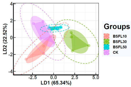 Linear discriminant analysis (LDA) is a generalized version of Fisher’s linear discriminant approach used to identify a linear combination of features from two classes of objects or events for characterization or discrimination. As shown in Figure 4, LD1 and LD2 accounted for 65.34% and 22.52% of the variance, respectively. BSFL30 showed distinct differences from the CK group as well as from BSFL10 and BSFL50. In contrast, BSFL10 appeared to be closer to the CK group. There was a small overlap between the BSFL50 and CK groups, suggesting a considerable alteration in the intestinal microflora structure in the BSFL replacement groups compared to the CK group. The BSFL30 group exhibited the most significant changes. The partial overlap between the BSFL10 group and CK group may have resulted from the restoration of the intestinal microflora structure as the grouper adapted to the increased level of BSFL substitution.