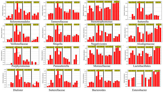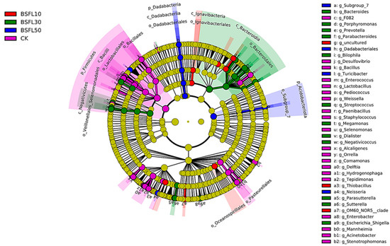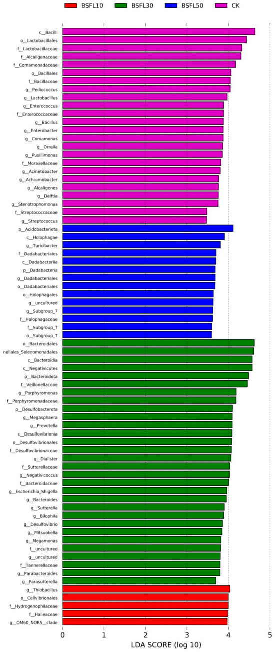 Figure 7 illustrates the multilevel species hierarchy tree derived from the LEfSe analysis. The circle radiating outward represents the phylum-to-genus classification level (or species), with the innermost yellow circle marking the border. A total of 58 genera of bacteria were identified as significant factors in distinguishing between the groups. The BSFL10, BSFL30, and BSFL50 groups exhibited a similar in comparison to the CK group, with relative abundances greater than 0.01%. This suggests significant differences in abundance (Figure 8). The CK group had slightly higher relative abundances of Moraxellaceae, Lactobacillus, Enterobacter, Bacillaceae, Comamonas, Stenotrophomonas, and Alcaligenes compared to the BSFL10, BSFL30, and BSFL50 groups. Furthermore, the BSFL30 and BSFL50 groups showed significantly higher relative abundances of various bacterial genera including Porphyromonas, Parasutterella, Dialister, Sutterellaceae, Bacteroides, Bilophila, Negativicoccus, Selenomonadales, Tannerellaceae, Sutterella, Veillonellaceae, Shigella, and Negativicutes.