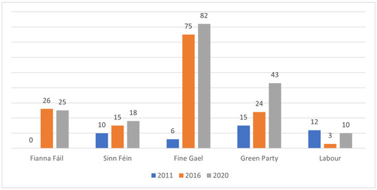 Fianna Fáil, established in 1926, dominated Irish politics after the Second World War but experienced a decline in seats in 2011 [33]. Alongside Fine Gael, established in 1933, Fianna Fáil’s manifestos supported high animal welfare standards but also endorsed horse and greyhound racing, live livestock exports, and wildlife protection [34,35]. The Green Party, established in 1981, increased its seats from 3 to 12 in 2020 [32] and advocated for more animal welfare regulations and the recognition of animals as sentient beings [36].