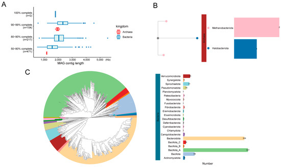 Basic information of assembled MAGs. Distribution of genomic integrity and quality classification of MAGs (A). Archaea (B) and bacteria (C) phylogenetic tree of 844 MAGs from the donkey hindgut.