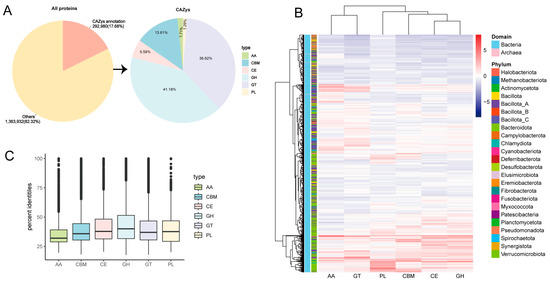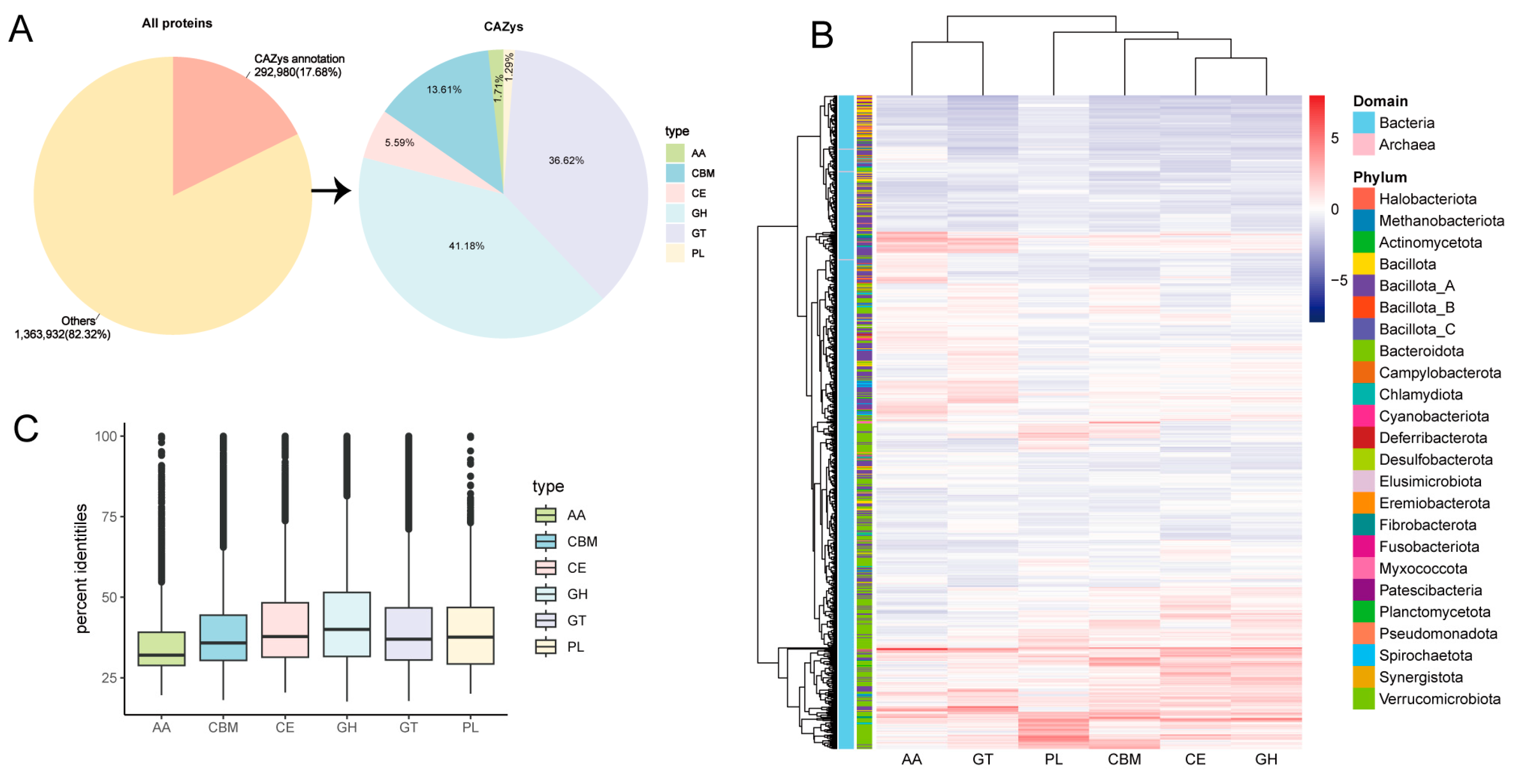 CAZyme annotation of MAGs in the donkey gut. Pie charts of annotation results obtained using dbCAN2 (A). Heatmap of the CAZyme distribution (B). Sequence similarity between CAZymes in this study and public databases (C). Proteins with auxiliary activity (AA), carbohydrate-binding modules (CBMs), carboxyesterases (CEs), glycosyl hydrolases (GHs), glycosyl transferases (GTs), and polysaccharide lyases (PLs).