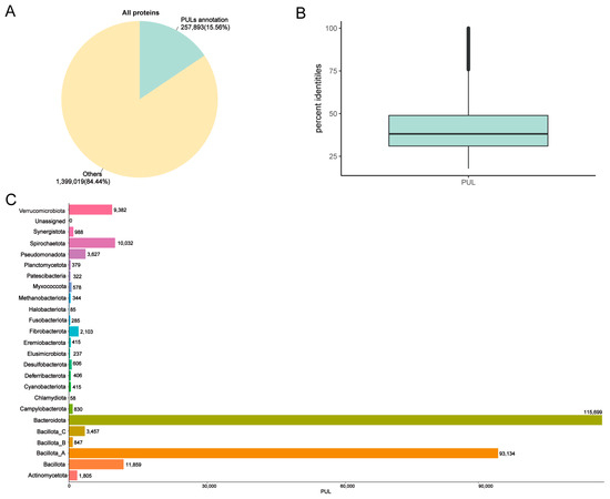 PUL annotations of MAGs in the donkey gut. Annotation results obtained using DBCAN-PUL database (A). Sequence similarity between polysaccharide utilization loci (PULs) in this study and public databases (B). Distribution of PULs in the phylum (C).