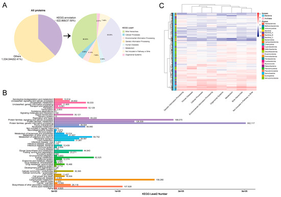 KEGG pathway annotations of MAGs in the donkey gut. Annotation results obtained using KEGG (A). KEGG pathway annotations in level 2 (B). Distribution of KEGG pathways in the phylum (C).
