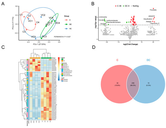 The cecum (C), ventral colon (VC), and dorsal colon (DC) of four donkeys were selected for MAG comparative analysis. The Principal Coordinate Analysis (PCoA) revealed that the MAGs of the C and DC groups could be distinguished (p = 0.027) (Figure 5A). Therefore, C and DC groups were selected for further analysis, and there were 36 MAGs with significantly higher abundances in the C group using the t-test (p < 0.05) but not the Mann–Whitney test, including Prevotella, UBA4372, Desulfovibrio, Alistipes, Treponema_D, etc.; and 9 MAGs were higher in the DC group (t-test, p < 0.05), including Limimorpha, F23-B02, Lentihominibacter, Saccharofermentans, RUG099, Lactobacillus, etc. (Figure 5B,C).