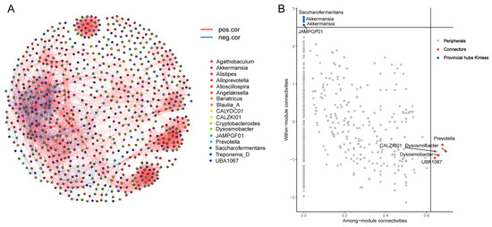 The cecum makes up about 12–15% of the total capacity of the gastrointestinal tract. It contains a dense population of anaerobic bacteria, with concentrations ranging from 1.85 × 107 to 2.65 × 109 cfu/mL [11]. These bacteria form complex ecological networks through interactions such as cooperation, competition, and predation [63]. Our study reveals a strong connectivity among the bacterial species in the cecum, with Prevotella and Dysosmobacter identified as key connectors with high intermodular connectivity. Akkermansia and Saccharofermentans, on the other hand, show significant intramodular connections and function as provincial hubs. Prevotella, in particular, plays a central role in cooperative and competitive interactions with various components of the gut microbiota, making it a keystone taxon [64]. Meanwhile, Dysosmobacter, a relatively understudied bacterium known for its production of butyric acid, has shown promise in mitigating diet-induced obesity and metabolic dysfunctions in murine models, suggesting its potential as a novel probiotic [65]. The presence of Prevotella and Dysosmobacter likely has a significant impact on the structure and function of the donkey gut microbiota. Akkermansia, on the other hand, has been associated with a lower the risk of inflammatory bowel disease, obesity, and type 2 diabetes mellitus [66]. Our study also confirms Akkermansia as a provincial hub strain in the donkey cecum, consistent with previous research showing its unique presence in healthy individuals and its role in host immune function [67,68]. Saccharofermentans, with its ability to degrade polysaccharides and produce volatile fatty acids, plays a crucial role in fiber utilization and intestinal health in the hindgut of the donkey. This bacterium is important for regulating the structure and function of the microbial community in the donkey’s gastrointestinal tract [69]. However, further research is needed to understand the mechanisms and roles of these connector and hub species in donkeys. Our study provides a comprehensive genome-wide assembly of these bacteria, establishing a foundation for future investigations into their functional roles in the donkey gastrointestinal tract.