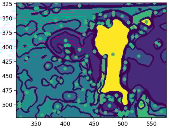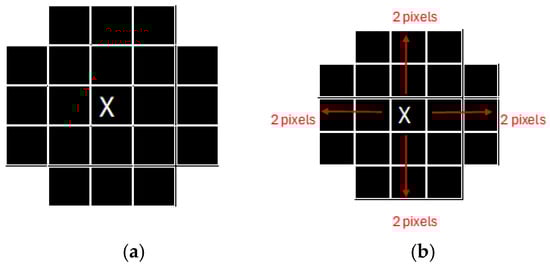 For instance, as illustrated in Figure 1, the segmentation process begins with the definition of a target shape within the image. In Figure 1a, the target feature is identified by calculating pixel distances relative to a central pixel. Specifically, two pixels are measured from the bottom to the central pixel, two pixels from the central pixel to the top, and two pixels each from the east and west. This structured approach facilitates the accurate delineation of the desired feature’s shape.