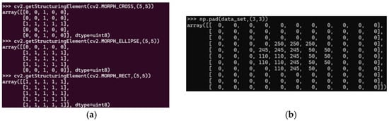 Another practical application of mathematical morphology involves leveraging morphological operations available in libraries such as OpenCV. As demonstrated in Figure 2, morphological operations can employ various structuring elements, including cross, elliptical, or rectangular shapes. These structuring elements determine the regions where morphological operations are applied, with pixels denoted by 1 indicating areas of operation and pixels denoted by 0 representing non-operational areas. The adaptability of these structuring elements enhances the flexibility and robustness of morphological analysis, allowing it to be tailored to a wide range of image-processing tasks.