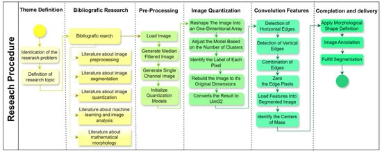 Following the theme definition, a comprehensive literature review involves gathering the relevant literature on crucial topics, including image preprocessing, segmentation, quantization, machine learning in image analysis, and mathematical morphology. Sources are selected based on their contributions to these subfields, providing theoretical grounding and identifying established methodologies, tools, and unresolved challenges. The findings from the literature review informed the design of processing stages and helped justify the choice of analytical tools and approaches (Figure 5).