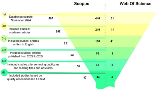 A systematic search of the Scopus and Web of Science databases was conducted using keywords related to image preprocessing and machine learning. An initial pool of 507 records, filtering by article type to include only peer-reviewed academic articles, was reduced to 257. Applying a language filter to select articles written in English further narrowed the selection to 231 articles. Restricting the publication date to the period between 2022 and 2024 yielded 62 articles, a timeline chosen to capture the most recent advancements in the field. After removing duplicates and conducting a detailed screening of titles and abstracts, 56 articles were subjected to a quality assessment. Ultimately, 47 articles were selected based on their relevance to the research topic. This systematic and rigorous selection process ensured a high-quality and focused dataset of studies, providing studies that met specific quality and relevance criteria in image preprocessing, segmentation, quantization, feature extraction, and mathematical morphology within the context of machine learning and image analysis.