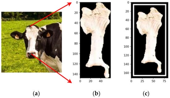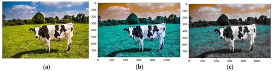 Each pipeline component uses an image of a cow (Figure 7a). The pipeline begins by loading the input image using robust image-handling libraries. This step ensures compatibility with downstream operations by standardizing input dimensions, resolution, and intensity distributions. Images are resized to a fixed resolution, and pixel intensity normalization is applied to create a consistent dataset for processing. These adjustments mitigate variability across input images, reducing preprocessing overhead.