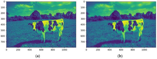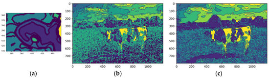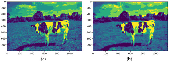 The analysis targets key visual features by isolating the dominant color channel. The image was linearized and reshaped into a two-dimensional array while maintaining the BGR channel structure, enabling the application of a computationally efficient single-channel convolution kernel. Dimensionality reduction preserves essential visual features while improving efficiency for segmentation. Figure 8 illustrates the original image (a), its single-channel representation, and the median-filtered version (b). The median-filtered image (b) proves more effective for segmentation, particularly in distinguishing the cow from the background by homogenizing grass texture, thereby enhancing object differentiation.