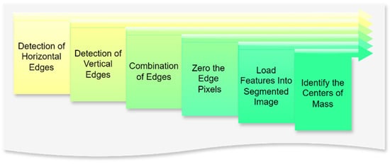 Edge pixels are zeroed to isolate contiguous regions, creating well-defined segments by distinctly separating adjacent areas. Detected features are loaded into the segmented image, preserving spatial and contextual relationships, with centers of mass calculated and included as precise reference points for analysis or classification. This standardized approach ensures replicability through consistent convolutional operations and parameter settings while enhancing machine learning training via structured feature extraction. Potential biases from specific kernel designs are mitigated by diverse feature detection strategies, ensuring robustness across visual contexts. Integrating edge detection, segmentation, and feature localization provides a solid framework for interpreting visual data in complex environments.