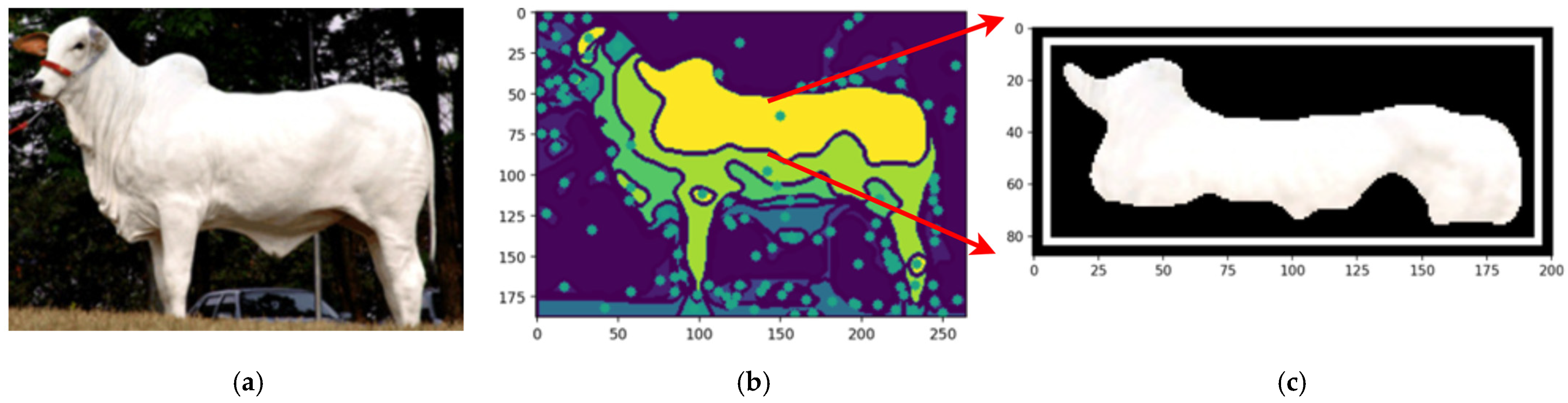 Original image of Nelore Cattle (a), centers of mass of the image (b), and the feature segmented (c). Sources: (a) Adapted from [49] Nelore Breeders Association of Brazil (2024) and (b,c), created by the authors.