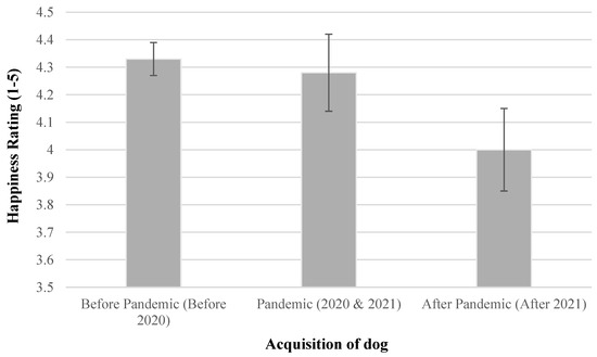 Mean ratings of dog owner happiness with their dog’s behaviour, comparing owners who acquired their dogs before, during, or after the COVID-19 pandemic. Error bars represent the standard error of means.
