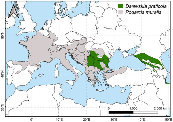Distribution ranges of Darevskia praticola and Podarcis muralis. The red dot on the map represents the geographic position of this study locality. The shapefiles used for the map were downloaded from the IUCN Red List of Threatened Species [50,52].