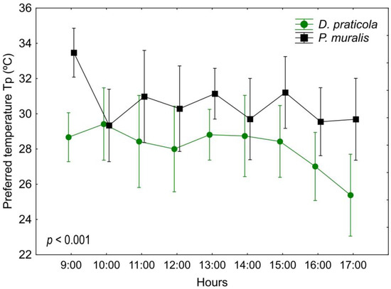 Daily variation of the preferred body temperatures (Tp) of Darevskia praticola and Podarcis muralis, showing a different pattern between the two species. Displayed are the mean values and 0.95 confidence intervals. The presented p-value illustrates the magnitude of the difference in Tp between the species.