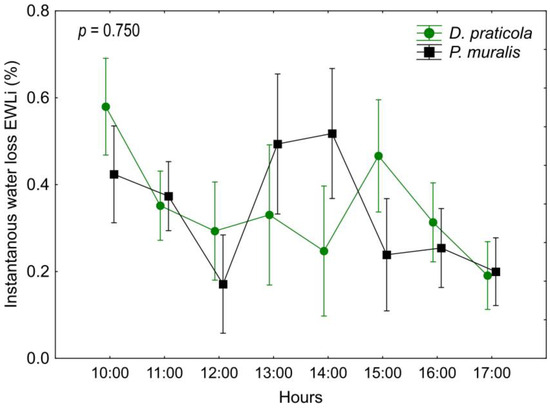 Daily variation of the instantaneous water loss (EWLi) of Darevskia praticola and Podarcis muralis, showing a different pattern between the two species. Displayed are the mean values and 0.95 confidence intervals. The presented p-value illustrates the magnitude of the difference in EWLi between the species.