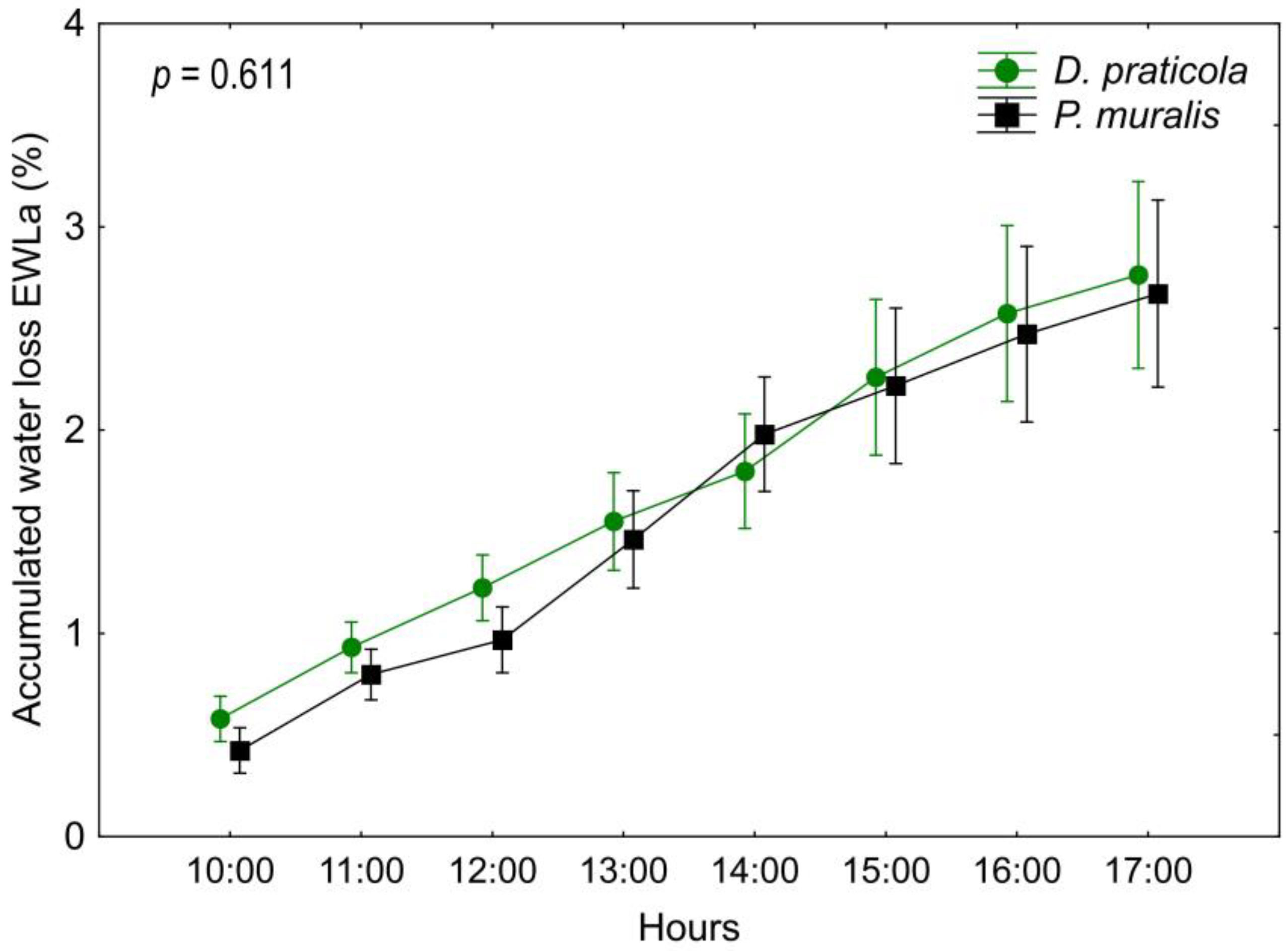 No significant correlations between mean Tp and EWLt were detected in either of the species, indicating a lack of support for a trade-off between these variables (D. praticola: R = −0.2; p = 0.580; P. muralis: R = 0.2; p = 0.580).