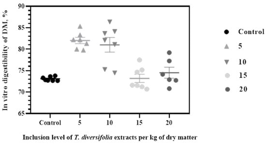 The TDE significantly enhanced the IVDMD at inclusion levels of 5 g and 10 g/kg of DM. For experiment 1, the inclusion of TDE positively influenced the IVDMD at low levels (p = 0.001).