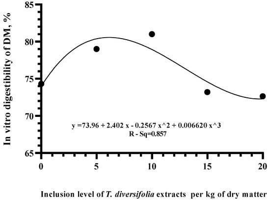 Polynomial regression of in vitro digestibility of dry matter (IVDMD) in a diet with forage to concentrate ratio of 66:34 at different inclusion levels of TDE.