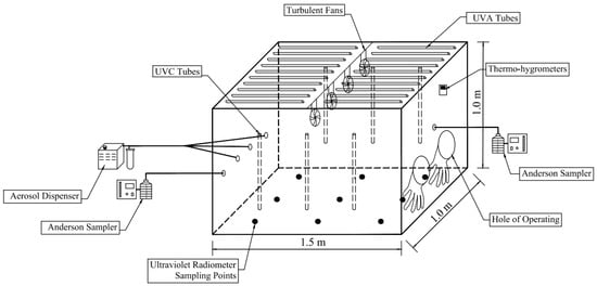 Figure 1 shows the schematic diagram of the experimental setup. It mainly includes an acrylic test chamber equipped with UVA and UVC tubes, an aerosol dispenser (HY-220, Beijing Zhongbang Industrial Technology Co., Ltd., Beijing, China), and the six-stage Anderson samplers (TISCH, TEI Corp., Hamilton, OH, USA). The literature showed that aerosol test chambers may vary in size from regularly 1–2 cubic meters to rooms approximately 30–50 cubic meters [24]. Chambers with a capacity of around 1 m3 were normally used in existing research. For example, Paez-Rubio and Peccia estimated the solar and nonsolar inactivation rates of airborne bacteria with a 1 m3 chamber using a sampling flow rate of 12 L min−1 [25]. Hasegawa et al. [26] studied the bacterial culturability during bioaerosol challenge using a test chamber of 1 m3 at a low sampling flow rate of 20–28.5 L min−1 and using a test chamber of 3 m3 at a high sampling flow rate of 100 L min−1. The test chamber in this study is 1.5 m long, 1.0 m wide, and 1.0 m high, with a capacity of 1.5 m3. There are eight air nozzles evenly distributed on both sides of the chamber for aerosol generation, gas sampling, and air exchange. Rubber gloves are installed with holes on one side of the chamber to facilitate the experiment operation in the test chamber when it is closed. Totally twenty UVA tubes (340 nm, 600 mm long, 40 W), which can run independently, were installed on the top of the test chamber. Turbulent fans are installed in the chamber for gas distribution, and six UVC tubes are installed on two side walls of the chamber for inner sterilization before and after each experimental test. Air temperature and relative humidity in the chamber were logged using a recorder (179A-TH, Apresys Inc., Los Angeles, CA, USA) every 5 min during the experiment.