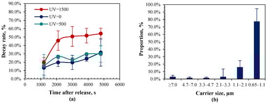 Figure 2a shows the curve of decay rate along with the time after the release of airborne bacteria. The curve of decay rates is very close to each other between the target UVA radiation of 0, 500, and 1000 µW cm−2. For a better visual display, Figure 2a only shows the curve of decay rates at the target UVA radiation of 0, 500, and 1500 µW cm−2. At the same condition, the decay rates of airborne bacteria tended to increase rapidly with time at the very beginning and then remain relatively stable. Taking the experimental condition at target UVA radiation of 1500 µW cm−2 as an example, its average decay rate rose from 19.5% to 45.7% within the time from 20 min to 35 min after the release of bioaerosol, whereas its decay rate stabilized at about 50% within the time from 50 min to 80 min after the release of bioaerosol. Figure 2b gives the size distribution of the airborne bacteria aerosolized into the chamber at the target UVA radiation intensity of 1500 µW cm−2. The generated airborne bacteria were mainly distributed in the fine particles whose diameter was less than 2.1 µm. The measured proportion of carriers was 77.1 ± 17.5%, 15.6 ± 9.1%, 2.7 ± 10.9%, 1.3 ± 1.3%, 1.3 ± 1.5%, and 2.7 ± 2.4% in the size range of 0.65–1.1 µm, 1.1–2.1 µm, 2.1–3.3 µm, 3.3–4.7 µm, 4.7–7.0 µm, and ≥7.0 µm, respectively.