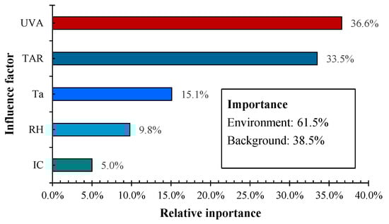 As mentioned above, the initial concentration (IC), UVA intensity, Ta, and RH in the experimental setup, as well as time after release (TAR), would affect the decay rate of airborne bacteria. To further analyze the impacts of these factors, a statistical model based on a random forest algorithm was developed to relate the bioaerosol concentrations to these impact factors using the measured data in previous sections. The root mean square error (RMSE) was 6.8%, and the R2 was 0.81, which indicates the good reliability of the developed model. Results showed that UVA intensity was the most important factor affecting the decay rate in this study. The relative influence of the surveyed factors was ranked in the order of UVA > TAR > Ta > RH > IC. These impact factors are further divided into two categories, i.e., environmental factors (Ta, RH, UVA) and background factors (IC, TAR). Using the feature importance analyzed through RF algorithms, the importance of influence factors to the decay was plotted in Figure 3. As shown in Figure 3, environmental factors had a greater impact on the decay of airborne bacteria, while the influence of background conditions cannot be ignored, especially the TAR.