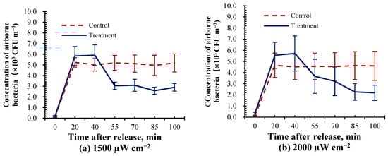 Concentration of airborne bacteria between control and UVA treatment in test chamber. (a) UVA radiation intensity at 1500 μW cm−2; (b) UVA radiation intensity at 2000 μW cm−2.