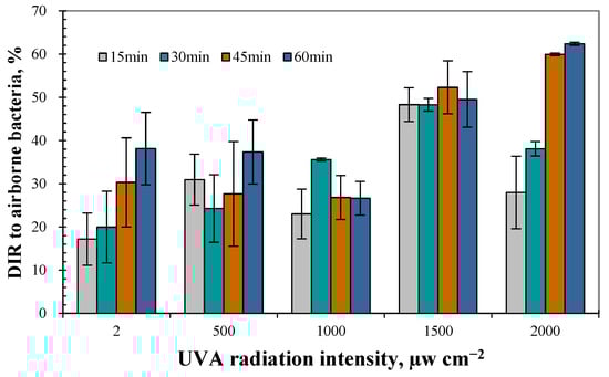 Ranging from 17.2% to 62.4%, Figure 5 shows the DIR of UVA to airborne bacteria at different radiation intensities and radiation durations. Much higher DIRs of airborne bacteria was observed when the radiation intensity was over 1500 μW cm−2 (p < 0.05), while there was no significant difference between the DIR when the radiation intensity was 2, 500, and 1000 μW cm−2 (p > 0.05). The DIR of airborne bacteria ranged from 28.0% to 62.4% at the radiation intensity of 2000 μW cm−2 and positively relates to the increased radiation durations, which averaged 47.1%. Under the radiation intensity of 2 μW cm−2, it also showed a positive correlation between DIRs and radiation duration, and the average DIR was 26.4% during the whole experimental duration of 60 min. However, DIR showed little change with radiation duration under the radiation intensity of 500, 1000, and 1500 μW cm−2, whose average DIR was 28.0%, 31.0%, and 49.6%, respectively.