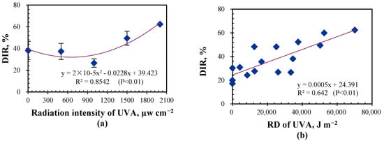 Figure 6b illustrates the linear regression curve of DIR to RD and of DIR to radiation intensity. Taking the RD of 36,000 J m−2 as an example, this could be a combination of the radiation intensity of 2000 µW cm−2 with the radiation duration of 15 min or the combination of the radiation intensity of 500 µW cm−2 with the radiation duration of 60 min. The measured DIR was 28.0% at the radiation intensity of 2000 µW cm−2 with the radiation duration of 15 min and was 37.3% at the radiation intensity of 500 µW cm−2 with the radiation duration of 60 min. Based on the regression curve, DIR would be 33.4% at the RD of 18,000 J m−2, which is close to the mean (32.6%) of measured DIR at the radiation intensity of 2000 µW cm−2 with the radiation duration of 15 min and the radiation intensity of 500 µW cm−2 with the radiation duration of 60 min. This suggests that similar DIR would be achieved using either a high radiation intensity with a short radiation duration or a low radiation intensity with a long radiation duration.
