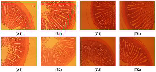 Slice atlases of duodenum and jejunum (40×). (A1–D1) represent the duodenum in the control, T1, T2, and T3 groups, respectively; (A2–D2) represent the jejunum in the control, T1, T2, T3 groups, respectively.