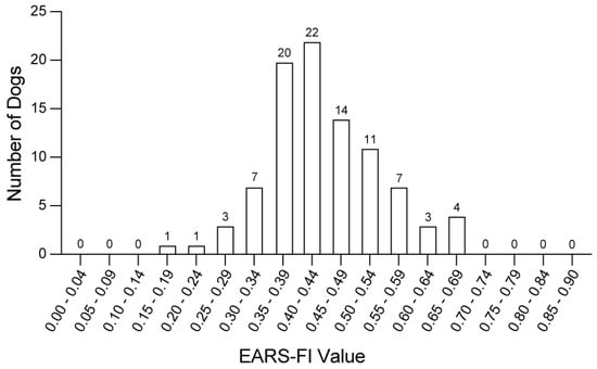 Median and range of FI values are shown in Table 2. Overall, median (IQR) of FI was 0.43 (0.38–0.50). There was no significant difference between median FI of females and males, 0.44 and 0.41, respectively (p = 0.89). The distribution of EARS-FI is shown in Figure 1. No dogs had FI < 0.18. Estimated frailty limit, defined as the 99th percentile of FI values, was 0.68.