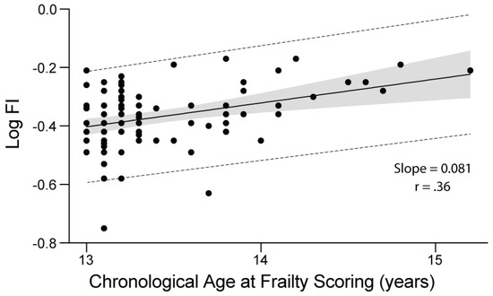 The relationship between deficit accumulation and chronological age in 93 dogs with extreme longevity in the Exceptional Aging in Rottweilers Study. Log FI values are plotted versus age at frailty index (FI) determination. Dots represent FI values for individual dogs. Shaded area represents 95% confidence interval. Dotted lines represent 95% prediction interval.