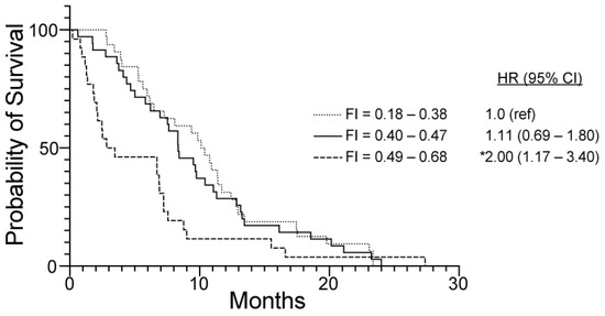 Kaplan–Meier survival curves representing dogs with extreme longevity in the Exceptional Aging in Rottweilers Study (n = 93). Three curves show survival stratified by tertiles of frailty index (FI): low FI (0.18–0.38, n = 32); middle FI (0.40–0.47, n = 35); high FI (0.49–0.68, n = 26). In this survival analysis, time to event is interval from age at frailty scoring to death. Hazard ratio (HR) and 95% confidence interval (95% CI) were generated using Cox proportional hazard modeling using lowest tertile of FI as reference (ref) group (HR = 1.0). * Mortality risk differs significantly from reference group, p = 0.01.
