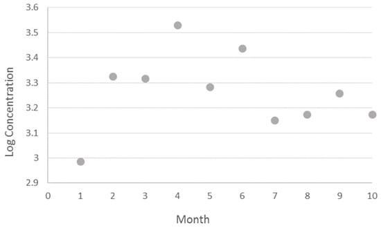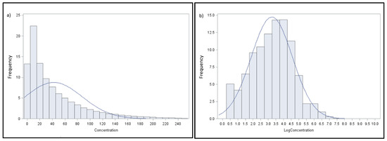 The distribution of the recorded variable is strongly asymmetric (Figure 2a); therefore, in order to obtain a normal distribution, the raw data were log-transformed [38] (Figure 2b).