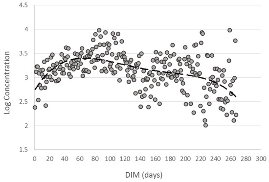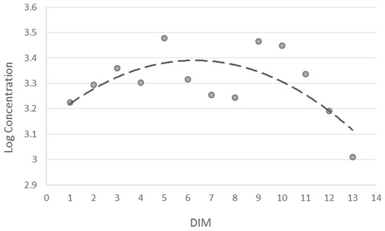 Regarding the sources of variation within normal farming practice that have been considered, the distance from calving (DIM) was confirmed to be significant (p < 0.0001), as reported in Table 2. In general, the CH4 emission curve appears to be superimposable to the estimated lactation curve for the Mediterranean Buffalo [45]. A similar pattern was reported by [46] for dairy cattle. Several authors have reported increasing daily methane emissions during the first 10 weeks followed by a stationary phase [47,48].